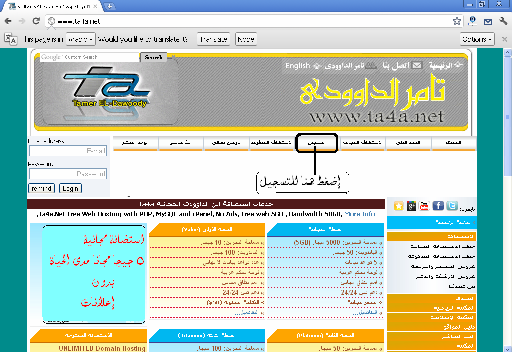 هنا فى هذه الصفحة شرح وافى لكيفية التسجيل فى الاستضافة Free web 5GB , Bandwidth 50GB, More Info |